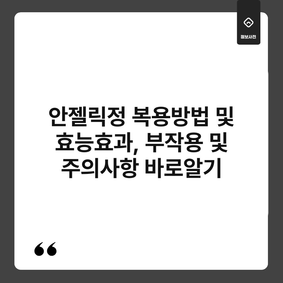 안젤릭정, 들어보신 적 있으신가요? 이 약물은 다양한 효능과 효과로 많은 사람들에게 사랑받고 있습니다. 그런데 어떻게 복용해야 할지, 혹시 부작용은 없는지 궁금하신 분들이 많으실 텐데요. 오늘은 안젤릭정의 복용방법과 효능효과, 그리고 부작용 및 주의사항에 대해 자세히 알아보겠습니다. 이 글을 통해 안젤릭정에 대한 모든 궁금증을 해결해드릴게요!