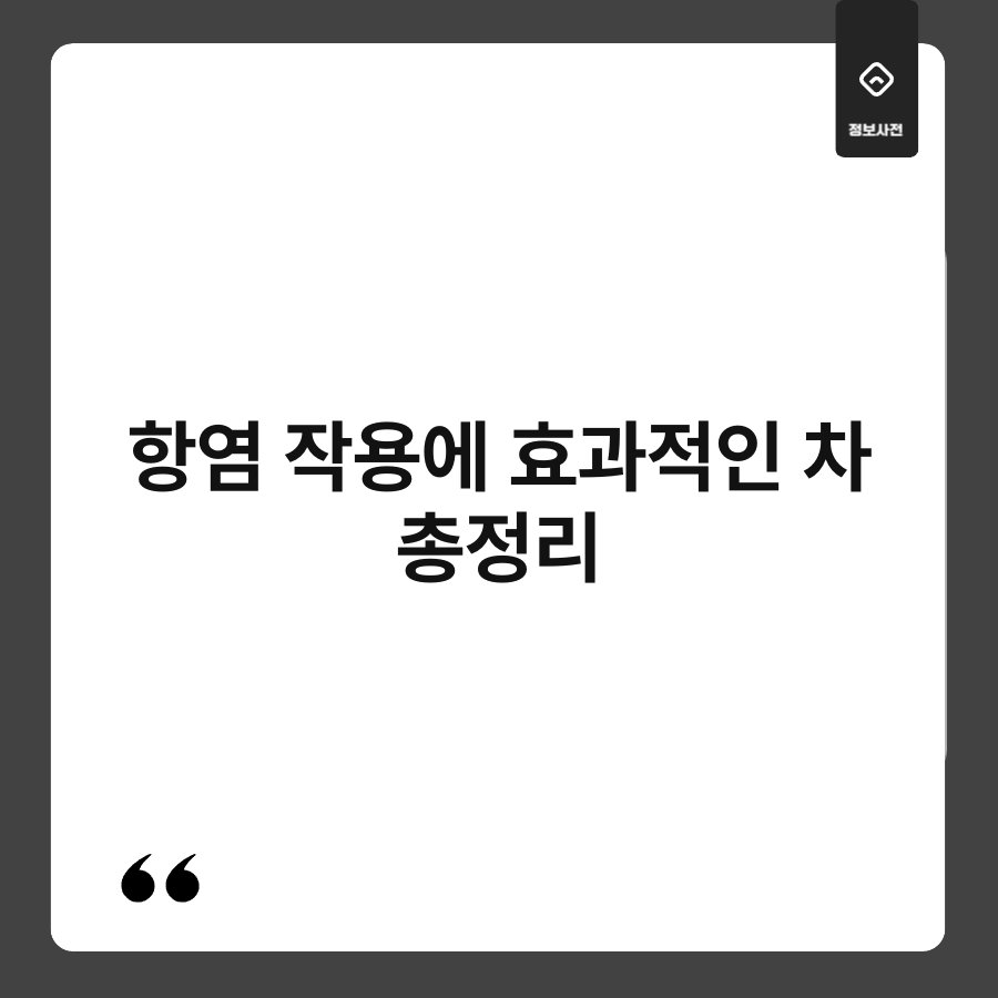 A1: 항염 작용이 있는 차로는 녹차, 생강차, 카모마일차, 페퍼민트차, 루이보스 차 등이 있습니다. 이 차들은 각각 염증 완화와 면역력 증진에 도움을 줍니다.