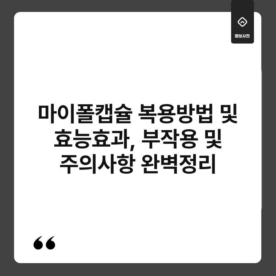 마이폴캡슐, 들어보셨나요? 많은 분들이 건강을 위해 다양한 영양제를 복용하는 요즘, 이 제품이 주목받고 있습니다. 마이폴캡슐의 복용방법과 효능효과를 통해 건강한 삶을 도와줄 수 있는 정보를 알아보겠습니다. 하지만 부작용과 주의사항도 꼭 체크해야 하겠죠? 이 글을 통해 마이폴캡슐에 대한 모든 것을 완벽하게 정리해드리겠습니다.