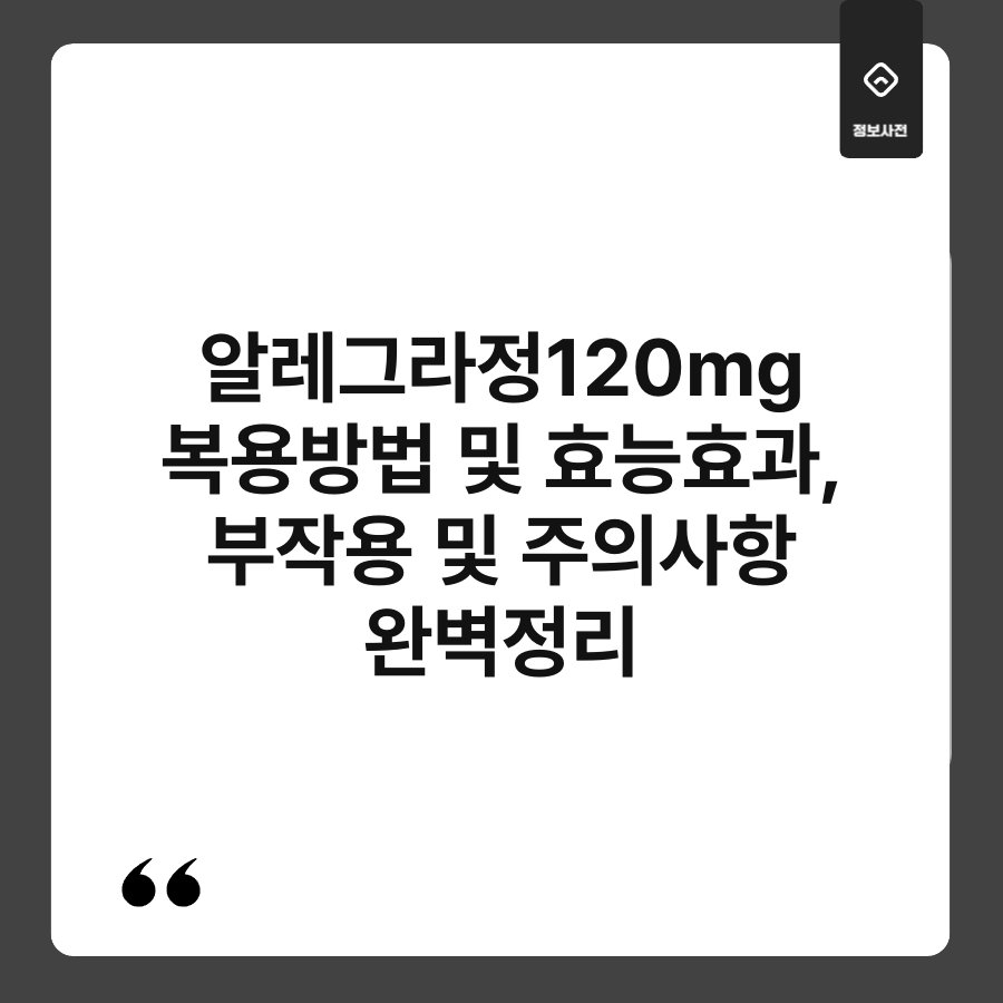 알레그라정 120mg, 들어보셨나요? 이 약은 알레르기 증상 완화에 도움을 줄 수 있는 항히스타민제입니다. 특히, 봄철 꽃가루나 먼지 등으로 괴로운 분들에게 큰 도움이 될 수 있죠. 오늘은 알레그라정의 복용 방법, 효능, 부작용 및 주의사항에 대해 자세히 알아보겠습니다. 이 정보를 통해 보다 나은 선택을 하실 수 있을 거예요.
