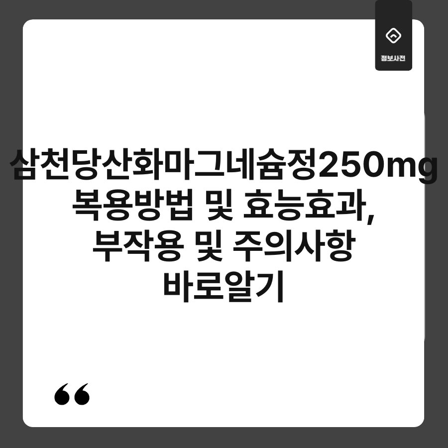 삼천당산화마그네슘정 250mg, 들어보신 적 있으신가요? 이 약물은 주로 위장 건강을 지원하는 데 도움을 줄 수 있습니다. 하지만 복용 방법, 효능, 부작용 및 주의사항까지 잘 알고 계신가요? 이런 정보는 여러분의 건강을 지키는 데 필수적입니다. 이번 글에서는 삼천당산화마그네슘정의 모든 것을 자세히 알아보겠습니다.