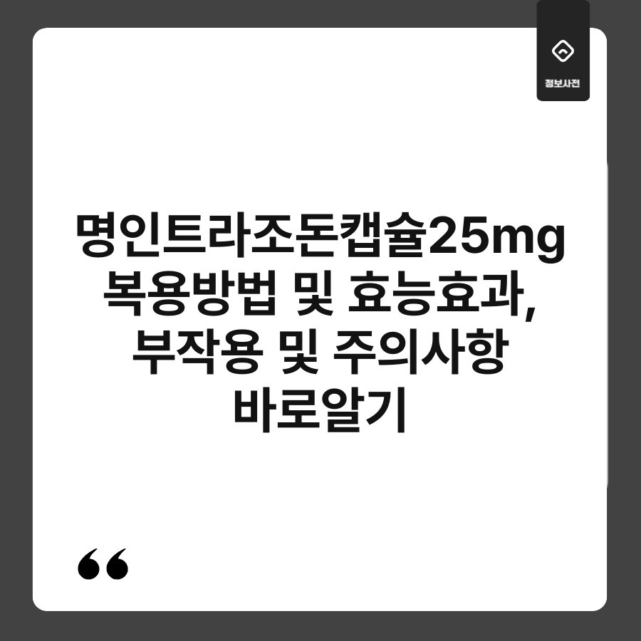 명인트라조돈캡슐 25mg, 들어보셨나요? 이 약물은 주로 우울증 치료에 사용되며, 불면증과 불안감 완화에도 효과적입니다. 하지만 복용 방법과 효능, 부작용에 대해 정확히 아는 것은 매우 중요합니다. 오늘은 명인트라조돈캡슐의 복용 방법, 효능효과, 그리고 주의사항을 자세히 살펴보겠습니다. 이 글을 통해 필요한 정보를 모두 얻어가시길 바랍니다.