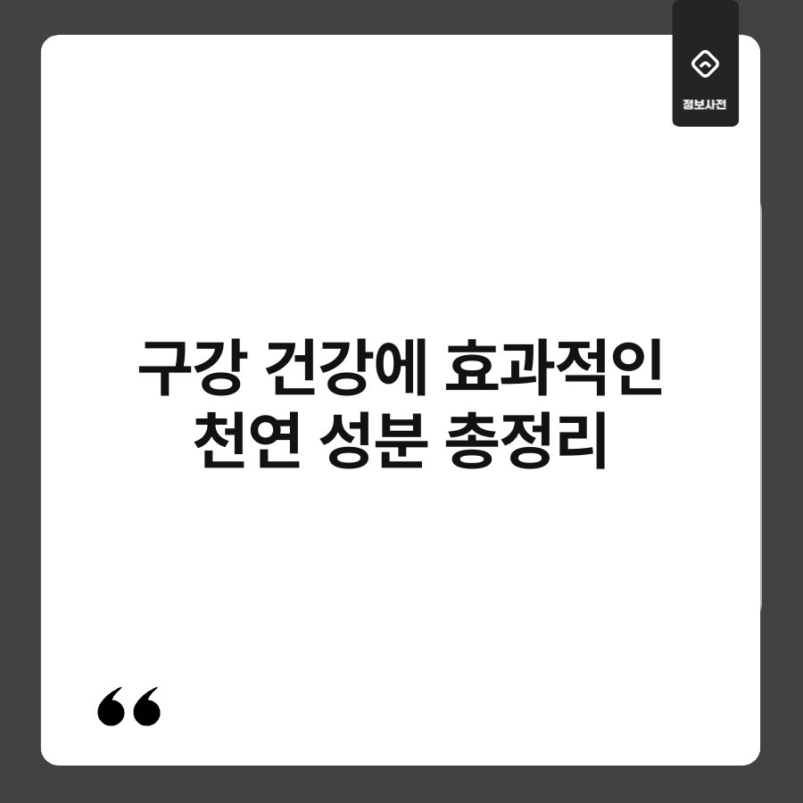 구강 건강, 모두가 소중히 여기는 부분이죠. 하지만 치아 관리나 구강 위생에 대해 고민할 때, 어떤 천연 성분이 효과적인지 막막할 때가 많으셨을 겁니다. 오늘은 구강 건강에 효과적인 천연 성분을 총정리해 보려고 합니다. 이 글을 통해 자연의 힘을 활용해 건강한 입안을 유지하는 방법을 알아보세요. 귀찮은 관리가 아닌, 간편하고 효과적인 방법들을 제안드릴게요.