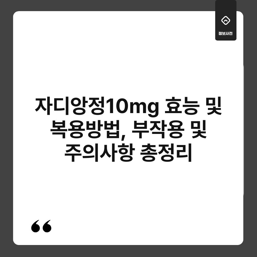 당뇨병 관리에 있어 중요한 역할을 하는 자디앙정 10mg, 궁금하신 분 많으실 겁니다. 이 약물이 어떻게 작용하는지, 복용 방법과 주의사항은 무엇인지 알아보도록 하겠습니다. 자디앙정은 혈당 조절에 도움을 주는 효과가 있지만, 부작용 또한 존재합니다. 이 글을 통해 자디앙정의 효능과 복용 방법, 부작용 및 주의 사항을 종합적으로 정리해 드릴게요. 함께 알아보시죠!
